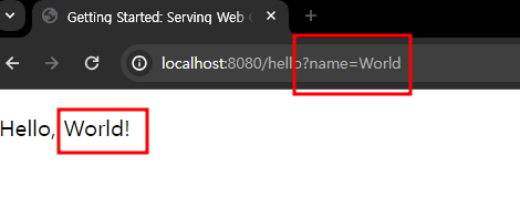 만약 http://localhost:8080/hello?name=XXX로 조회시, VIew에서 "|Hello, ${name}!|"에 name 대신 XXX값 할당한 후에 출력 - model.addAttribute