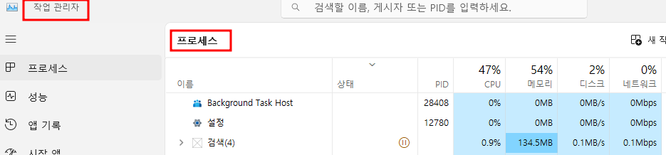 - 실행중인 프로그램 = 프로세스 라 하는데요. 작업 관리자를 통해 실행중인 프로그램을 확인할 수 있습니다.