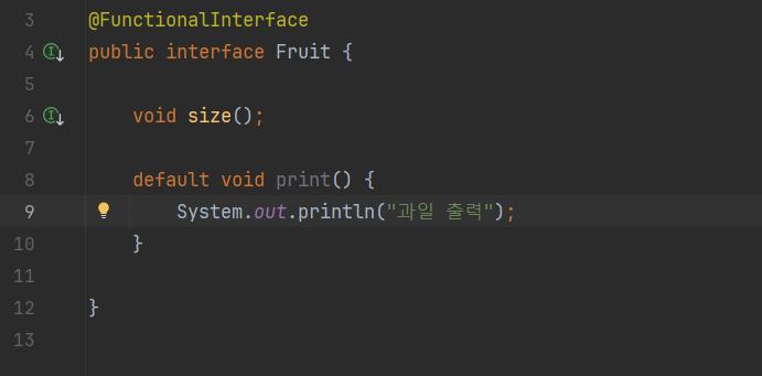 함수형 인터페이스(Functional Interface) API 공식문서에 따르면 아래와 같이 정의할 수 있습니다. 오직 하나의 추상 메소드만 가져야 한다. ㄴ 추상메소드 2개인 경우, Functional Interface X -> 컴파일 에러 발생 ㄴ 추상메소드 1 + 디폴트 메소드 1 인 경우에는, Functional Interface O -> 디폴트 메소드는 직접 구현을 하기 때문에 추상 메소드에 포함되지 않음 `@FunctinalInterface` 애노테이션 사용하여 함수형 인터페이스 조건에 맞는지 검사함 ㄴ애노테이션을 따로 붙이지 않아도 컴파일러가 알아서 식별함 ㄴ 가독성을 위해서 애노테이션을 붙이는 것을 권장함 예제 size라는 추상 메소드 하나와 출력을 위한 디폴트 메소드 하나를 가진 함수형..